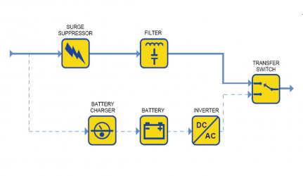 یو پی اس آفلاین پر کاربرد ترین نوع یو پی اس برای مصارف خانگی و کامپیوتر های شخصی می باشد . همانطور که در دیاگرام یو پی اس آفلاین نشان داده شده است در این نوع یو پی اس یک سوئیچ بر روی ورودی فیلتر شده برق شهری قرار دارد و زمانی که ورودی برق شهری قطع شود یو پی اس در کسری از ثانیه به روی اینورتر و باطری سوئیچ خواهد کرد در این نوع یو پی اس در حالت نرمال مصرف کنندگان برق مورد نیاز خود را بطور مستقیم از برق شهری می گیرند و زمانی که ورودی برق شهری قطع گردد تامین برق مصرف کنندگان از طریق باطری صورت خواهد گرفت و اینورتر و باطری تنها زمانی که ورودی از برق شهری قطع شود وارد مدار می شوند.